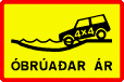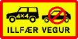 | Merki þetta er notað með A99.11 þar sem ekið er inn á leið sem er aðeins fær sérútbúnum torfærubifreiðum (jeppum og fjallabílum). Á leiðinni geta verið mjög brattar brekkur, snjóskaflar eða ár sem tæplega eru færar bifreiðum. |