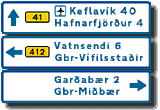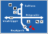 | Merki þetta má setja 150-250 m frá vegamótum. Vísun beint áfram komi efst, því næst vísun til vinstri og neðst vísun til hægri. Letra skal staðarheiti og vegnúmer á merkið eftir því sem ástæða þykir til. Á vegamótunum skal síðan setja upp vegvísa eftir því sem við á. | |