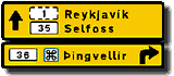 | Merki þetta má setja við vegamót, einkum þar sem akreinar eru fleiri en ein. Letra skal staðarheiti, vegnúmer og fjarlægð í km á merkið eftir því sem ástæða þykir til. Vísun beint áfram komi efst, því næst vísun til vinstri og neðst vísun til hægri | |