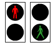 | Ljósmerkið skal vera með rauðu ljósopi sem sýnir mann í kyrrstöðu og grænu ljósopi sem sýnir mann á göngu. Grænt ljós sem slokknar og kviknar á víxl gefur til kynna að brátt skipti yfir í rautt ljós. Þar sem fleiri en eitt ljósmerki fyrir gangandi vegfarendur er í þeirri stefnu sem farið er gildir það merki sem næst er. | |